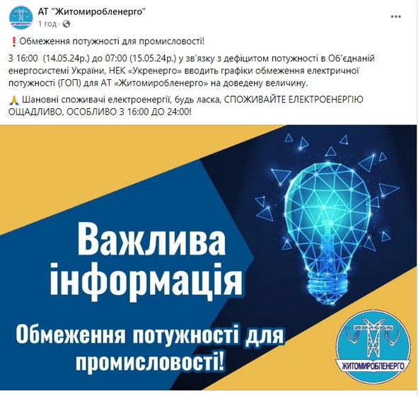 «Обмеження потужності для промисловості! З 16:00 (14 травня 24 року) до 07:00 (15 травня 24 року) у зв’язку з дефіцитом потужності в Об'єднаній енергосистемі України, НЕК «Укренерго» вводить графіки обмеження електричної потужності (ГОП) для АТ «Житомиробленерго» на доведену величину. Шановні споживачі електроенергії, будь ласка, споживайте електроенергію ощадливо, особливо з 16:00 до 24:00», - йдеться в повідомленні.
