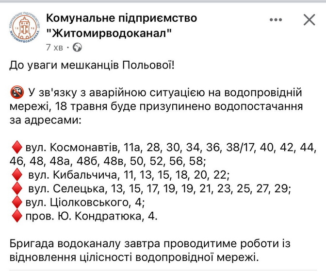«До уваги жителів Польової. У зв'язку з аварійною ситуацією на водопровідній мережі, 18 травня буде призупинено водопостачання за адресами: