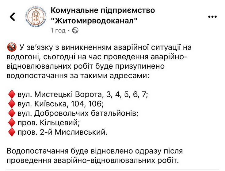 «У зв’язку з виникненням аварійної ситуації на водогоні, сьогодні на час проведення аварійно-відновлювальних робіт буде призупинено водопостачання за такими адресами: