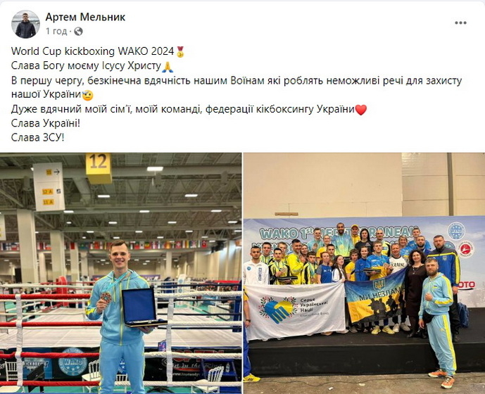 «World Cup kickboxing WAKO 2024. Слава Богу моєму Ісусу Христу. В першу чергу, безкінечна вдячність нашим Воїнам які роблять неможливі речі для захисту нашої України. Дуже вдячний моїй сімʼї, моїй команді, федерації кікбоксингу України. Слава Україні! Слава ЗСУ», - написав Артем Мельник на своїй сторінці у facebook.