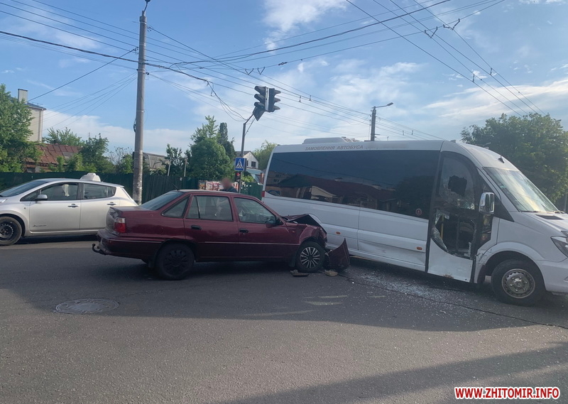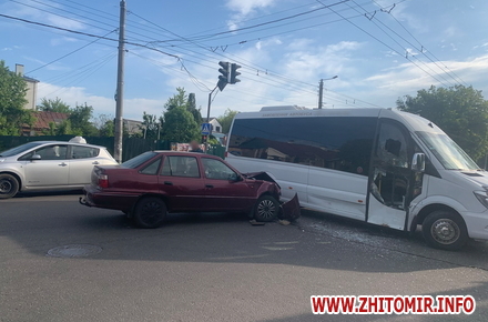 Вранці 21 травня на перехресті вулиць Михайла Грушевського та Князів Острозьких у Житомирі сталася ДТП за участю легкового автомобіля та мікроавтобуса.