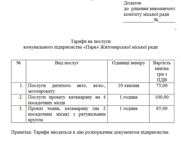 «Внести зміни та доповнення до рішення виконавчого комітету міської ради від 15.04.2020 № 439 «Про встановлення тарифів на послуги комунального підприємства «Парк» Житомирської міської ради» згідно з додатком. Ввести в дію тарифи з дня прийняття цього рішення», - йдеться в оприлюдненому 21 травня проєкті рішення виконкому.