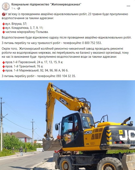 «Окрім того, Житомирський колійний ремонтно-механічний завод проводить ремонтні роботи на водопровідних мережах, які перебувають на балансі у вказаної організації, тому на час їх виконання буде призупинено водопостачання води за такими адресами: