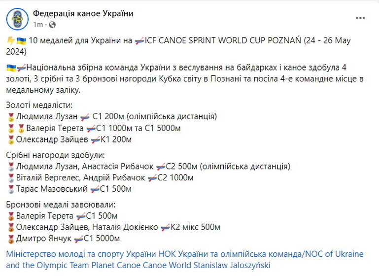 «З 24 по 26 травня 2024 року в м. Познань (Польща) відбувся Кубок світу з веслування на байдарках і каное – останні змагання з веслування на байдарках і каное світового рівня перед цьогорічними Олімпійськими іграми в Парижі. Наш екіпаж жіночої каное-двійки виборов «срібло»! Людмила Лузан та Анастасія Рибачок посіли друге місце на дистанції 500 м з результатом 1:57.54, поступившись 1.62 секунди олімпійським чемпіонкам з Китаю. Вітаємо наших медалістів та їх тренерів», - повідомили 27 травня в управлінні національно-патріотичного виховання, молоді та спорту Житомирської ОДА.