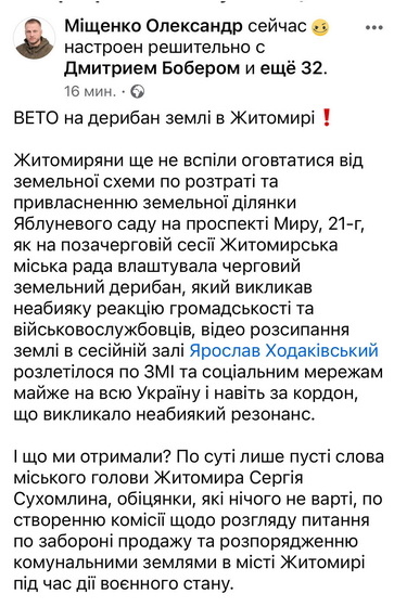 «І що ми отримали? По суті лише пусті слова міського голови Житомира Сергія Сухомлина, обіцянки, які нічого не варті, по створенню комісії щодо розгляду питання по забороні продажу та розпорядженню комунальними землями в місті Житомирі під час дії воєнного стану», - повідомляє Олександр Міщенко.