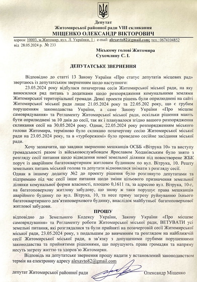 З цього приводу підготував на направив на міського голову Житомира Сухомлина С.І. депутатське звернення з прохання ВЕТУВАТИ усі земельні питання які були розглянуті під час скандальної позачергової сесії Житомирської міської ради, 23.05.2024 року.» - зауважив депутат райради Олександр Міщенко.