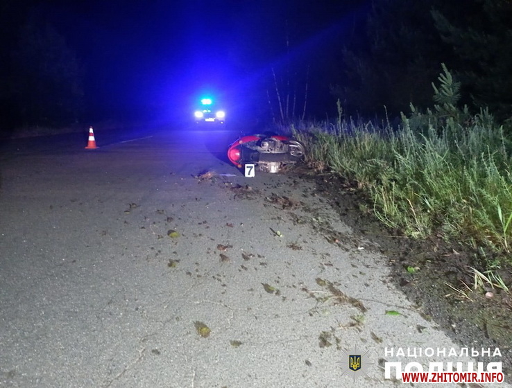 «Попередньо, близько 00:15 водій мотоцикла «Spark», рухаючись у напрямку села Межирічки, здійснив виїзд на узбіччя дороги, де сталося перекидання транспортного засобу. На жаль, від травм, отриманих у ДТП, керманич двоколісника, 30-річний житель Радомишльської громади, загинув», - йдеться в повідомленні.