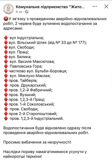 «У зв'язку з проведенням аварійно-відновлювальних робіт, 2 червня буде зупинено водопостачання за адресами: