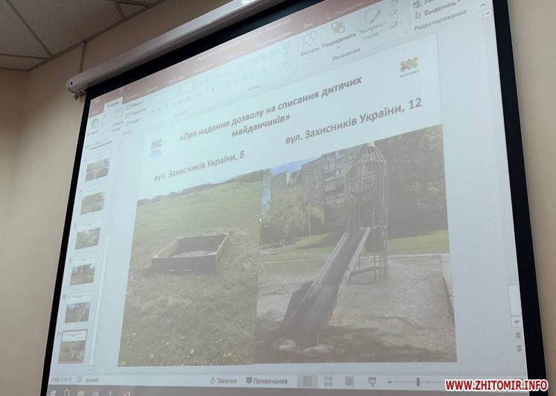«Даним проєктом рішення пропонується дозволити нашому комунальному підприємству ЖРЕП-6 (ред. - КП «Виробниче житлове ремонтно-експлуатаційне підприємство № 6» Житомирської міської ради) списати та зняти з балансу підприємства непридатні для експлуатації дитячі майданчики. У рішенні 7 адрес: проспект Миру, 10 - 2014 рік встановлений, стан незадовільний, залишкова вартість нуль; проспект Миру, 5 – 2017 рік встановлення, залишкова вартість нуль гривень; вул. Вільський шлях, 30 – 2013 рік встановлення, залишкова вартість нуль; вул. Захисників України, 28 – 2016 рік встановлення, залишкова вартість нуль гривень; вул. Домбровського, 6 – 2010 рік встановлення, залишкова вартість нуль гривень; вул. Лесі Українки, 47 – 2010 рік встановлення, залишкова вартість нуль; вул. Князів Острозьких, 118 – залишкова вартість нуль, 2014 рік встановлення», - розповів начальник управління житлового господарства міської ради Андрій Гуменюк.