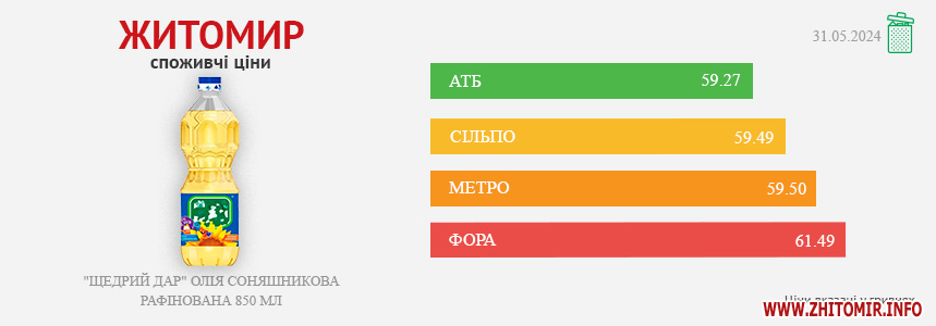 Моніторинг здійснено на основі інформації, отриманої за методом контрольної закупки 31.05.2024 р. у місцях продажу: АТБ, пр. Миру, 15 А, Фора, вул. Лятошинського, 2, Метро, вул. Ватутіна, 55-в, Сільпо, вул. Житній ринок, 1