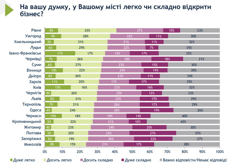 Щодо економічного розвитку, то лише 29% житомирян відповіли позитивно на це питання. Водночас лише 27% житомирян вважають, що у місті легко відкрити бізнес – це один з найгірших показників серед усіх обласних центрів.