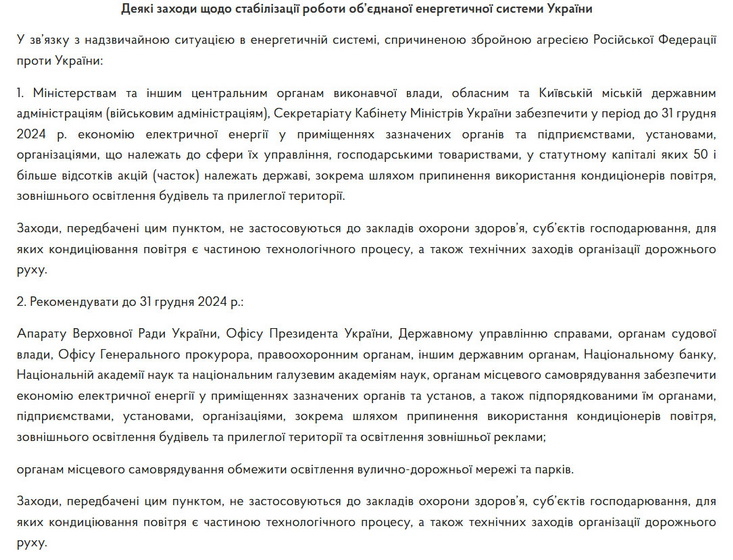 «Перед усіма органами державної влади поставлене завдання зменшити споживання електроенергії. Ухвалюємо сьогодні відповідне розпорядження Уряду. Міністерства, центральні органи виконавчої влади, обласні державні адміністрації мають відмовитися від використання кондиціонерів, зовнішнього освітлення будівель і прилеглої території. Ми також рекомендуємо правоохоронним органам, органам судової влади, іншим держорганам зробити аналогічні кроки. Місцевій владі – обмежити вуличне освітлення. Бізнес закликаємо також обмежити використання кондиціонерів та іншого енергоємного обладнання, яке не критичне для виробничої діяльності. Виняток – не буде обмежуватися використання кондиціонерів у лікарнях та на підприємствах, де кондиціонування повітря є частиною виробничого процесу», - сказав Денис Шмигаль.