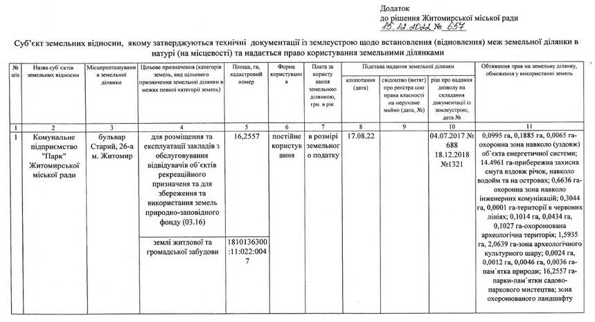 визнати незаконним та скасувати рішення Житомирської міської ради №657 від 15.12.2022 «Про розгляд заяв комунального підприємства "Парк" Житомирської міської ради» в частині затвердження технічної документації із землеустрою щодо встановлення (відновлення) меж земельної ділянки в натурі (на місцевості) кадастровий номер 1810136300:11:022:0047 та передачі її у користування КП «Парк» Житомирської міської ради;
