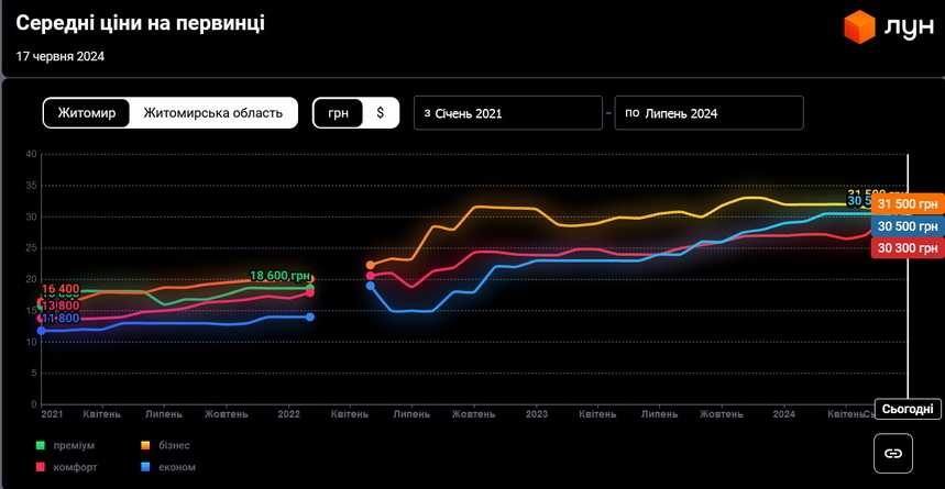 Щодо вартості 1 кв.м залежно від класу житла, то на 17 червня 2024 року у Житомирі різниці вже майже немає: «бізнес» - 31,5 тис. грн, «економ» - 30,5 тис. грн, «комфорт» - 30,3 тис. грн.