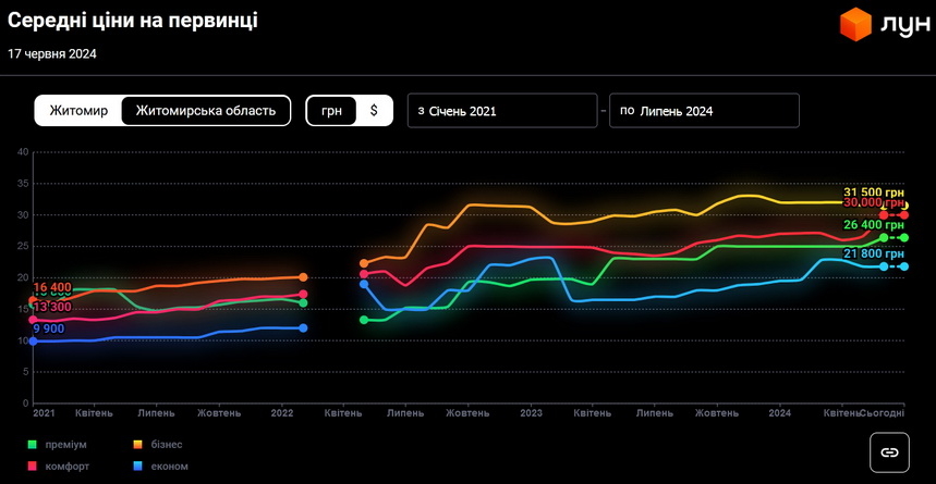По Житомирській області «бізнес» коштує так само, а інші класи трохи дешевші: «комфорт» - 30 тис. грн, «преміум» - 26,4 тис. грн, «економ» - 21,8 тис. грн.