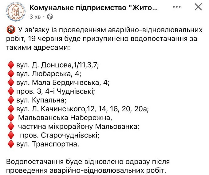 «У зв'язку із проведенням аварійно-відновлювальних робіт, 19 червня буде призупинено водопостачання за такими адресами: