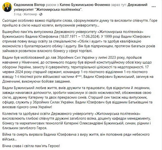 «Сьогодні особливо важко підібрати слова, сформулювати думку та висловити співчуття. Горе прийшло в сім’ю нашої колеги, випускників університету...Вшануймо пам'ять випускника Державного університету «Житомирська політехніка» Бужимського Вадима Юзефовича (18.07.1971 – 17.06.2024). У 1999 році Вадим Юзефович отримав повну вищу освіту за спеціальністю «Облік і аудит» та здобув кваліфікацію економіста з бухгалтерського обліку і аудиту. Він був підприємцем, протягом багатьох років займався розвитком власного бізнесу у сфері торгівлі», - повідомив Віктор Євдокимов.