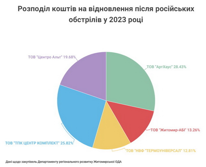 Упродовж 2023 році Департамент регіонального розвитку Житомирської ОДА уклав 35 угод для ліквідації наслідків збройної агресії рф в межах Житомира. Загальна вартість робіт на заміну вікон та дверей, а також ремонт фасадів склала майже 15 млн грн. Близько 80% угод замовник розділив між трьома житомирськими виконавцями: ТОВ «Артхаус», ТОВ «Торгово-промислова компанія Центр Комплект» та ТОВ «НВФ «Термоуніверсал».