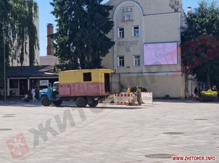 У Житомирі на вулиці Михайлівській 26 червня працівники КП «Житомирводоканал» ремонтують фонтан, який пошкодив автомобіль ДСНС 16 червня під час дитячого свята до Дня батька.