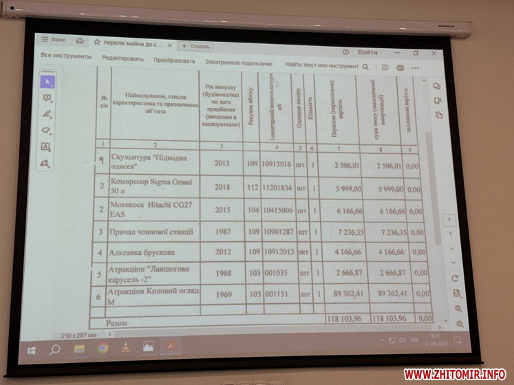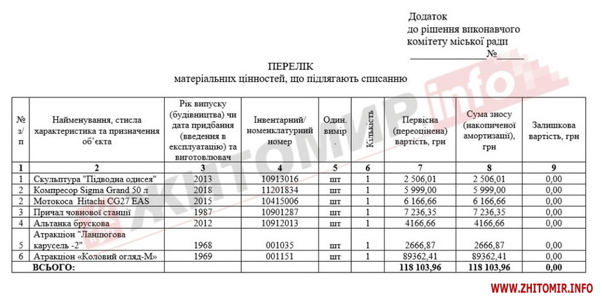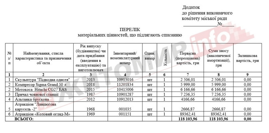 Також виконком підтримав проєкт рішення «Про надання дозволу на списання матеріальних цінностей комунальному підприємству «Парк» Житомирської міської ради». У списку на демонтаж є два старі атракціони – ланцюгова карусель 1968 року випуску у Шодуарівському парку та оглядове колесо 1969 року у гідропарку.