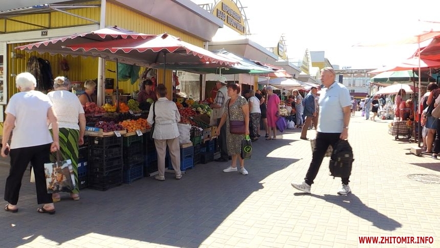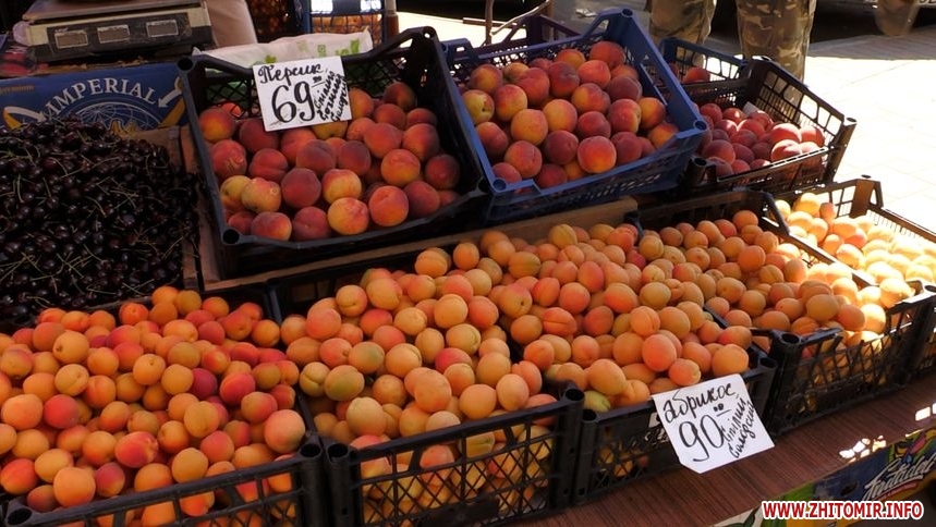 На Житньому ринку 27 червня житомиряни активно купують сезонні ягоди та фрукти, серед них: черешні, абрикоси, чорниці та малини. Продавчині кажуть, що весь асортимент з України.