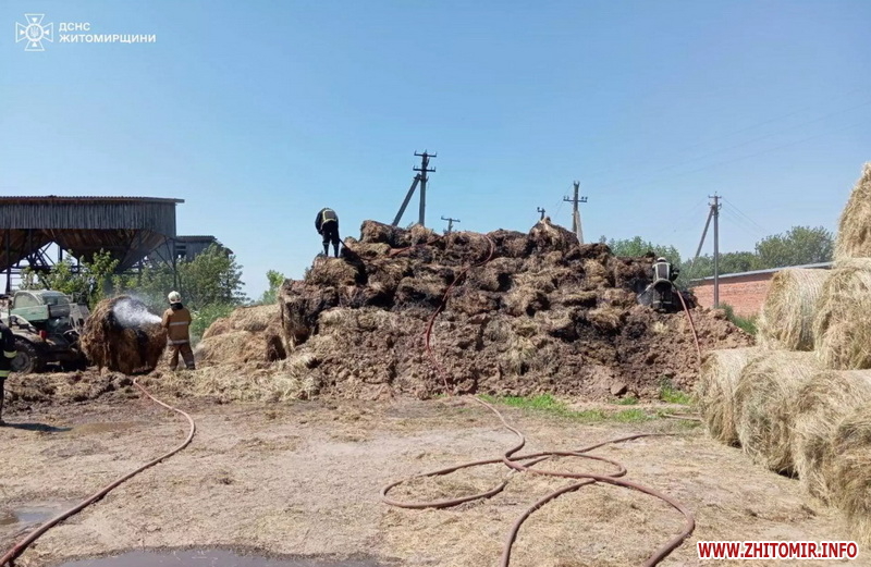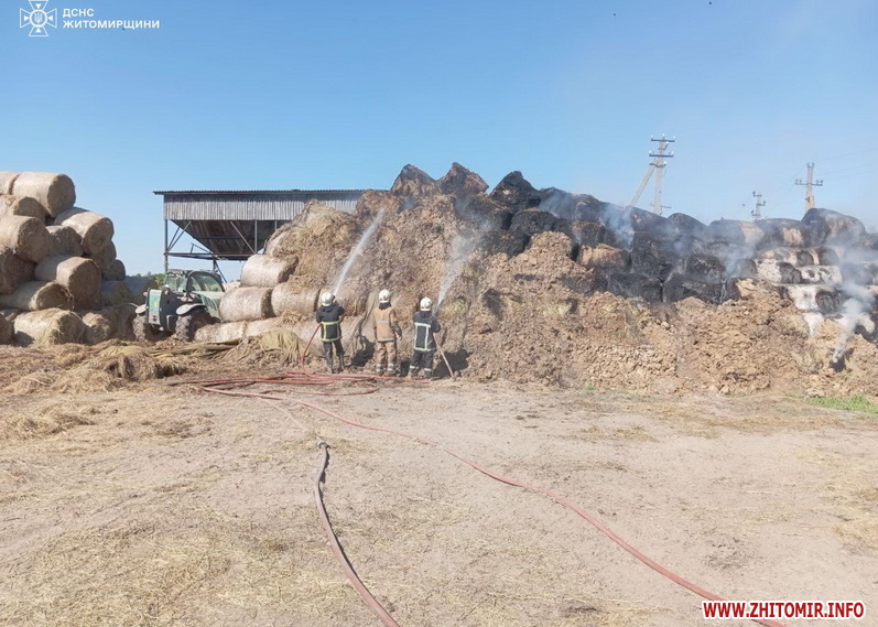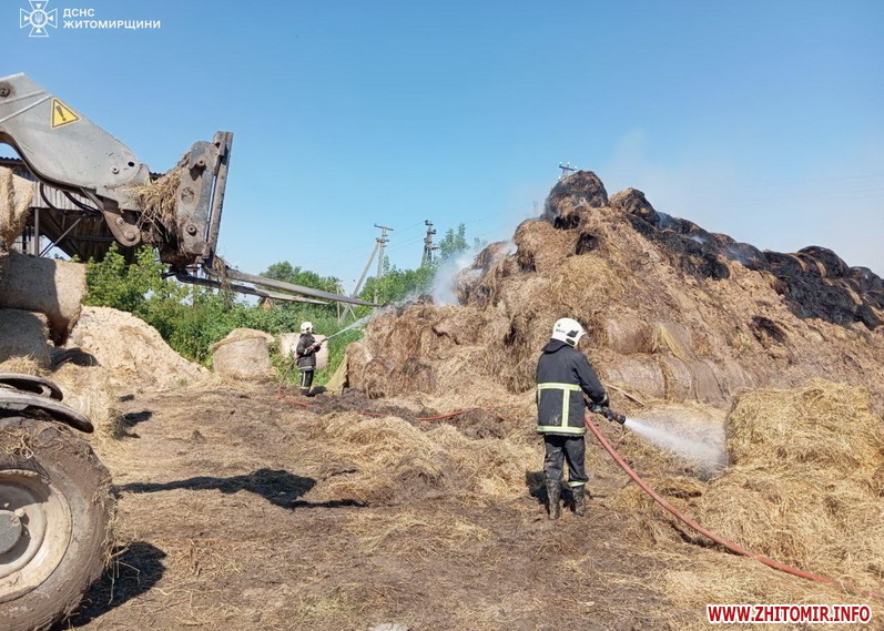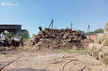 «1 липня о 8:35 до Служби порятунку «101» надійшло повідомлення про те, що у с. Ласки Народицької територіальної громади Коростенського району горить сіно на полі. На момент прибуття рятувальників було встановлено, що вогнем охоплено скирту сіна в тюках на площі 440 кв. м. Існувала загроза поширення пожежі на іншу скирту сіна, розташовану поруч. Для підвозу води долучились два трактори одного з місцевих підприємств», - йдеться у повідомленні.