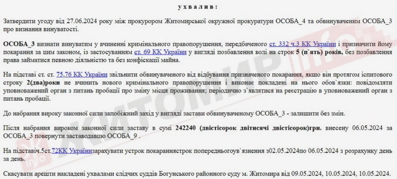 Вирок Богунського районного суду м. Житомира від 1 липня оприлюднений 2 липня у Єдиному державному реєстрі судових рішень.