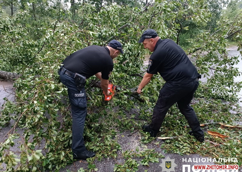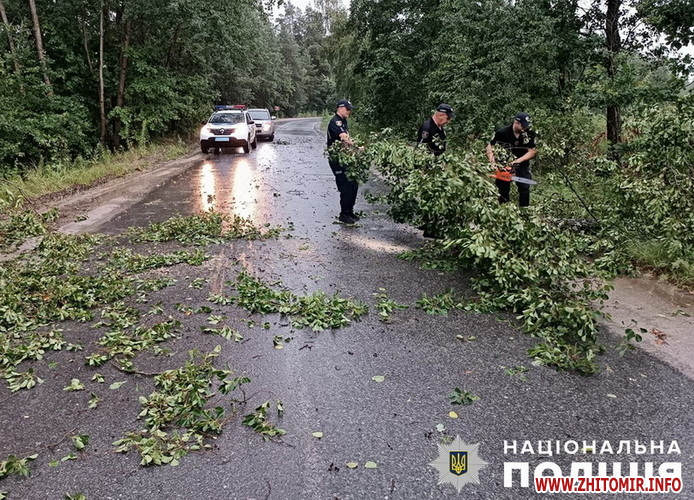«Вдень 2 липня через зливу та сильні пориви вітру на дорогу сполученням Ємилівка - Нова Борова, в Іршанській громаді, впали кілька дерев. Тож рух автотранспорту було заблоковано. У цей час на місці події опинилися поліцейські офіцери громади, які швидко усунули перешкоду», - йдеться у повідомлення.