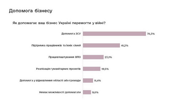 Український бізнес продовжує демонструвати високу соціальну відповідальність та активність. Реалізують програми підтримки для співробітників, долучаються до громадських ініціатив на місцевому рівні. За результатами опитування понад 70% мікро-, малого та середнього підприємництва надають фінансову допомогу Збройним силам України та в середньому передають 3% обороту.