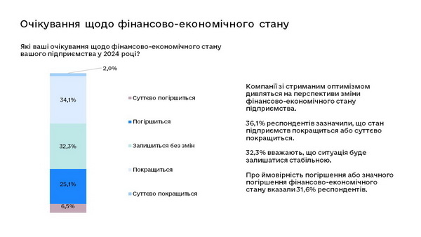 Так, за результати опитування 38% підприємців зазначили, що фінансово-економічний стан їхнього бізнесу середній, а 19% вважають його задовільним. Водночас близько 36% очікують на суттєве фінансове покращення, натомість 32% думають, що ситуація залишиться стабільною.