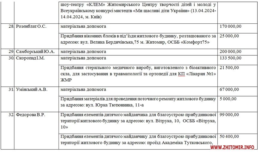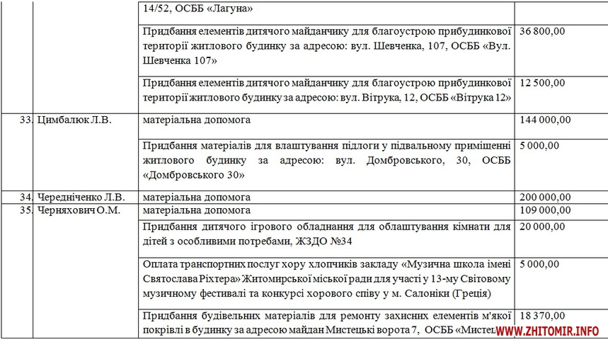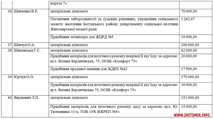 Олена Юрчук на матеріальну допомогу направила 170 тис. грн, на придбання матеріалів для поточного ремонту покрівлі ІІ під’їзду на вул. Велика Бердичівська, 75 – 30 тис. грн.