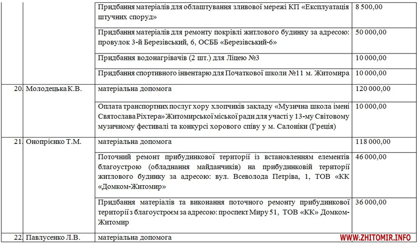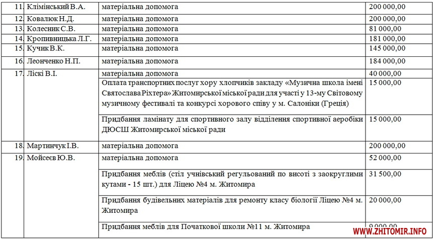 Деякі депутати спрямовували кошти на оплата транспортних послуг хору хлопчиків закладу «Музична школа імені Святослава Ріхтера» Житомирської міської ради для участі у 13-му Світовому музичному фестивалі та конкурсі хорового співу у м. Салоніки (Греція), сумарно 65 тис. грн: Олег Горай – 5 тис. грн, Людмила Зубко – 20 тис. грн, Вадим Ліскі – 15 тис. грн, Катерина Молодецька – 10 тис. грн, Олександр Ракович – 10 тис. грн, Олександр Черняхович – 5 тис. грн.