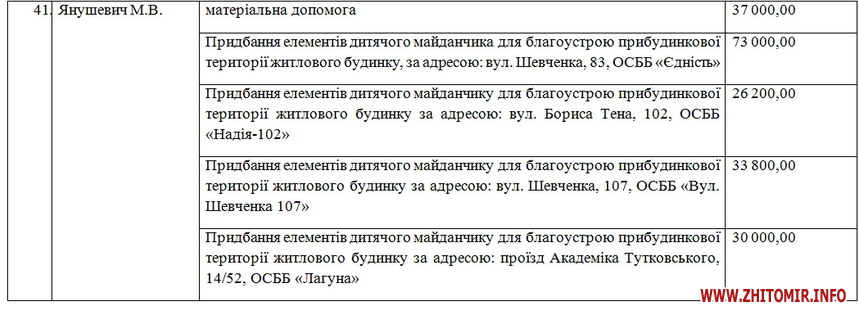Микола Янушевич розподілив кошти на п’ять напрямків: 37 тис. грн – матеріальна допомога; 73 тис. грн – придбання елементів дитячого майданчика для благоустрою прибудинкової території на вул. Шевченка, 83; 26,2 тис. грн – придбання елементів дитячого майданчику для благоустрою прибудинкової території на вул. Бориса Тена, 102; 33,8 тис. грн – придбання елементів дитячого майданчику для благоустрою прибудинкової території на вул. Шевченка, 107; 30 тис. грн – придбання елементів дитячого майданчику для благоустрою прибудинкової території житлового будинку на проїзді Академіка Тутковського, 14/52.