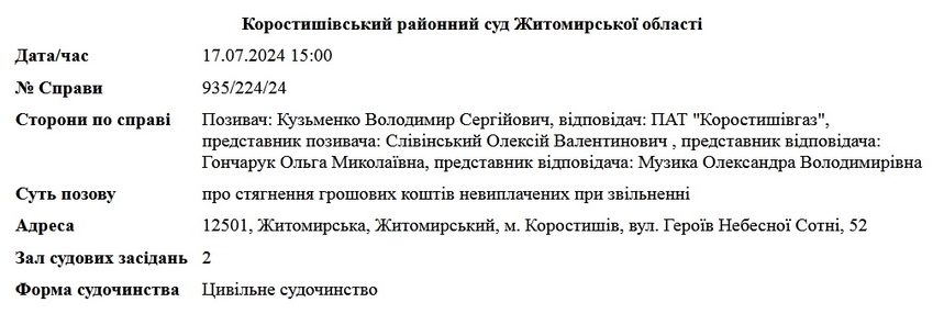 В січні 2024 року Кузьменко звернувся із позовною заявою до Коростишівського районного суду, в березні подав заяву про зменшення суми позовних вимог на 1,6 млн грн: залишення без розгляду позову в частині позовних вимог про стягнення заборгованості по заробітній платі в сумі 886 тис. 362,80 грн та вихідної допомоги в сумі 750 тис. 375,76 грн.