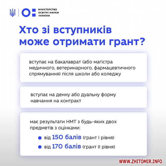 має результати НМТ (ЗНО) з будь-яких двох предметів з оцінками не менше ніж 150 балів (грант першого рівня) або не менше ніж 170 балів (грант другого рівня).