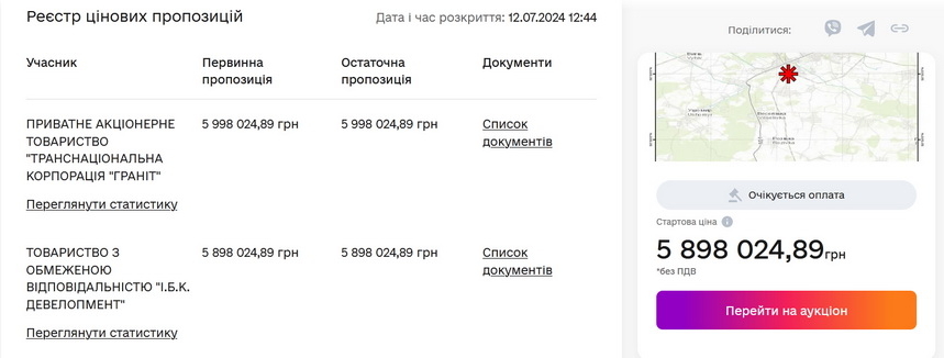 «Торги відбулися 12.07.2024. Єдиним конкурентом ТНК «Граніт» стало ТОВ «І.Б.К. Девелопмент» Олександра Лукʼянця, Олега Волинцева і Віталія Жуківського. Аукціон був другим повторним і стартував з 5 898 024,89 грн. Це удвічі менше, ніж початкова вартість першого аукціону (11 796 049,78 грн), який не відбувся 06.06.2024, і на чверть – порівняно з повторними торгами 25.06.2024. Зауважимо, під час попередніх спроб, ТНК Граніт не могла купити спецдозвіл, оскільки була єдиним учасником аукціонів (порядок вимагає, щоб учасників було щонайменше двоє)», - пише видання.