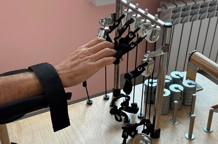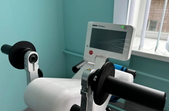 Також є мотомед – тренажер, який дає можливість тренуватися пацієнтам з колісного крісла. У нього є функція зворотного зв’язку: якщо в процесі роботи з педалями тренажер «ловить» напруження м’язів, він вмикає зворотний рух, щоб їх розслабити.