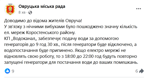 «КП «Водоканал», забезпечує подачу води за допомогою генераторів до 9 год. 30 хв., після генератори буде відключено, а водопостачання буде припинено. Якщо електромережі не відновлять свою роботу, то з 18:00 до 22:00 год. будуть повторно запущені генератори для постачання води до ваших помешкань», - попереджають жителів Овруча.