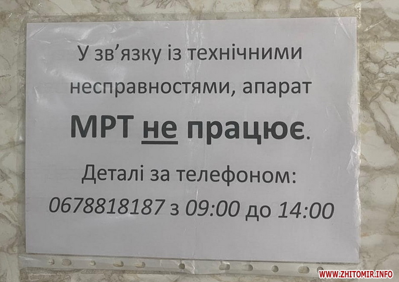 Комунальне некомерційне підприємство «Обласна клінічна лікарня ім. О.Ф. Гербачевського» Житомирської обласної ради має проблеми з роботою апарату МРТ.