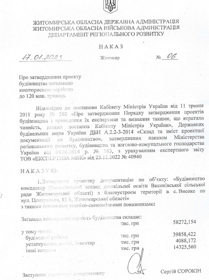 Як повідомляв Житомир.info, в січні 2022 року департамент регіонального розвитку ОДА провів тендер на будівництво комплексу Високівського закладу дошкільної освіти з благоустроєм території в селі Високе та уклав договір з ТОВ «УК «Комфорт-Буд» на виконання робіт за 34 млн 939 тис. 995 грн. Держаудитслужба проводила моніторинг закупівлі, але порушень не виявила. Втім, додатковою угодою від 27 грудня 2022 року договір з підрядником, якому нічого не заплатили, був розірваний «за угодою сторін». В грудні 2022 року, до розірвання договору, департамент регіонального розвитку ОДА заплатив 60 тис. грн за коригування проєктної документації по цьому об’єкту.