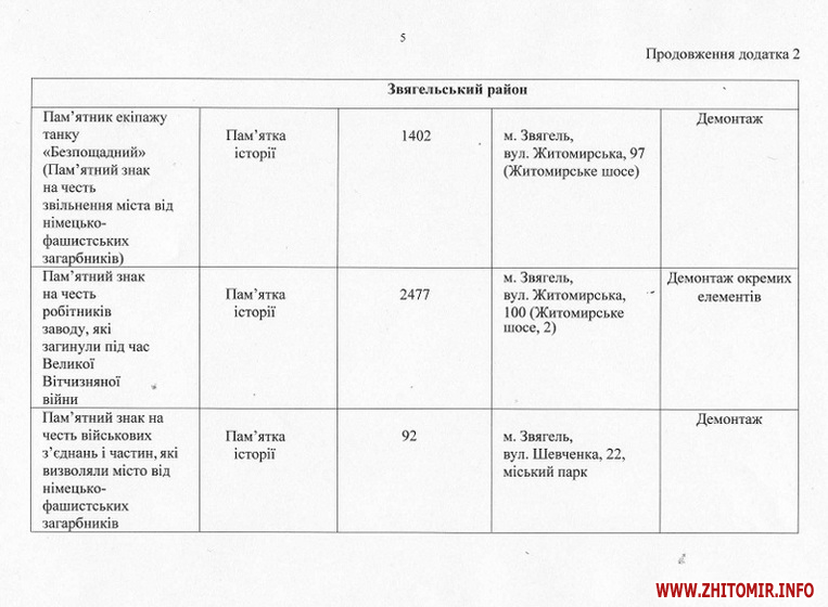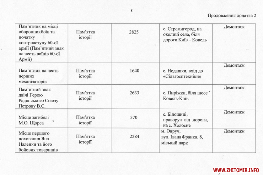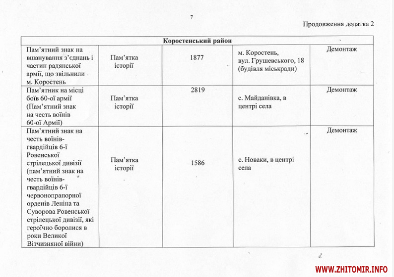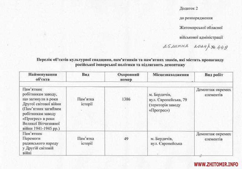 Відповідно до розпорядження Житомирської обласної військової адміністрації від 25 липня 2024 року № 449, у Житомирській області було перейменовано 348 вулиць та представлено перелік 40 об’єктів культурної спадщини, пам’ятників та пам’ятних знаків, які містять пропаганду російської імперської політики та підлягають демонтажу (або демонтажу окремих елементів).