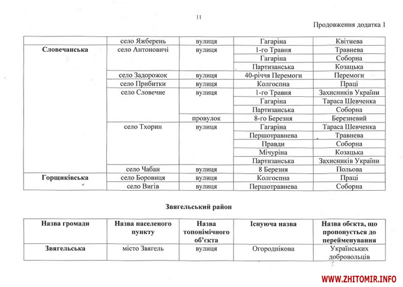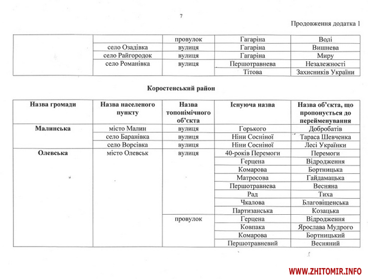 «Розпорядженням Житомирської обласної військової адміністрації була створена робоча група з питань деколонізації топонімії, до складу якої увійшли відомі краєзнавці, історики, депутати обласної ради, керівники комунальних закладів і структурних підрозділів ОВА. З урахуванням пропозицій громадськості, робоча група провела три засідання, на яких було розроблено перелік вулиць, що підлягають перейменуванню та список пам’ятників та пам’ятних знаків, які необхідно перенести з публічного простору», - повідомляє ОВА.