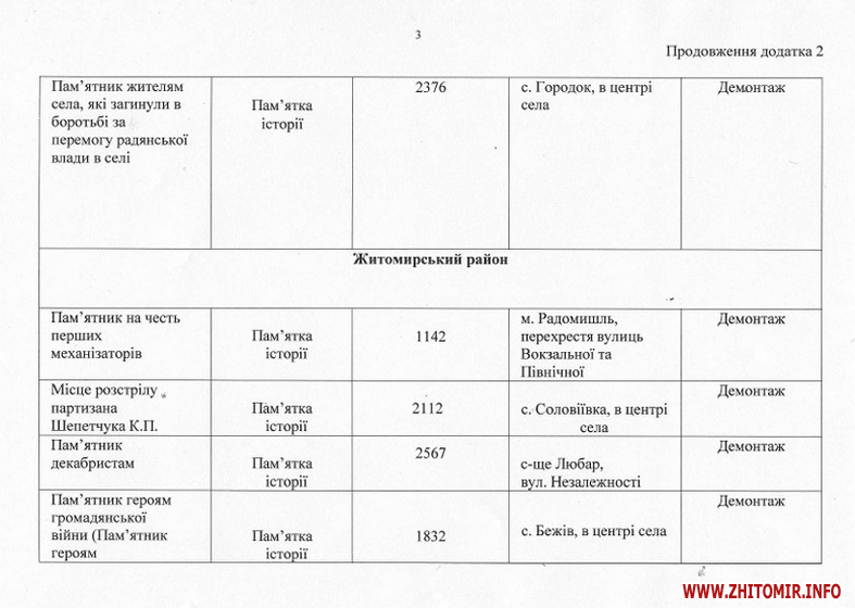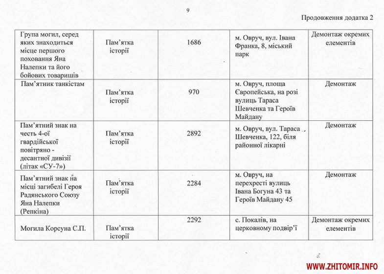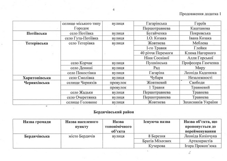 Як повідомляв Житомир.info, в липні 2023 року набрав чинності закон «Про засудження та заборону пропаганди російської імперської політики в Україні і деколонізацію топонімії»: місцевим радам давали 6 місяців на вилучення з публічного простору назв та пам’ятників, присвячені російським імперським діячам та географічним об’єктам країни-агресора; якщо вони не виконували норми закону, то такі повноваження на 3 місяці переходили до голів громад, а потім на 3 місяці до ОДА.