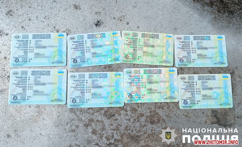 Слідчі слідчого управління ГУНП в Житомирській області провели низку обшуків та вилучили понад 20 свідоцтв про реєстрацію вантажного та легкового транспорту, майже десяток державних номерних знаків, паспорти громадян України та водійські посвідчення на різні імена, три автомобілі, частину металобрухту, тенти на вантажівку.