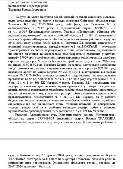 Зокрема, в рішенні серед підстав дострокового припинення повноважень Ткаченка згадується: кримінальна справа 2012 року, де він є обвинуваченим у хабарництві та шахрайстві (Корольовський райсуд вироком від 09.09.2021 року Ткаченка виправдав, справа зараз перебуває в апеляційному суді); постанова суду від 29 листопада 2023 року про штраф в розмірі 17 тис. грн за водіння у нетверезому стані та позбавлення прав на рік; цьогорічна справа, де він є підозрюваний у розтраті коштів та підробці документів. Також в рішення сільради посилаються на рішення суду про відсторонення підозрюваного від посади секретаря Оліївської сільської ради до 26 липня 2024 року включно.