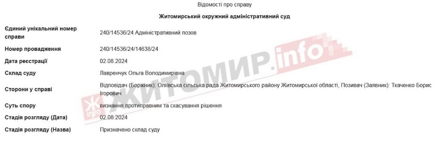 Водночас Борис Ткаченко звернувся до Житомирського окружного адміністративного суду з позовом до Оліївської сільської ради про визнання протиправним та скасування рішення сесії щодо дострокового припинення повноважень секретаря ради.