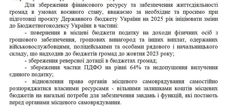 У самому зверненні зазначається, що заплановане зниження частки зарахування до бюджетів місцевого самоврядування податку на доходи фізичних осіб із 64 до 60% у 2025 році зменшить находження до бюджету Житомирської громади на суму близько 116,4 млн грн і це «призведе до загрози незабезпечення сталого проходження опалювального періоду та своєчасних розрахунків за комунальні послуги і енергоносії».