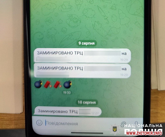 «Серед її «цілей» – об’єкти критичної інфраструктури, навчальні заклади, правоохоронні структури, органи влади та місцевого самоврядування, а також місця масового перебування громадян. 10 серпня ц.р. жінка здійснила чергове неправдиве «замінування» – одного із торговельних центрів Житомира. Повідомлення про загрозу вибуху вона надіслала адміністрації мережевого будівельного супермаркету. У цій же будівлі у центрі Житомира функціонують ряд торговельно-розважальних закладів. На місце події негайно прибули співробітники СБУ, поліції, ДСНС і евакуювали з приміщення відвідувачів та персонал. Працівники вибухотехнічної служби обстежили будівлю і прилеглу територію, будь-яких небезпечних предметів не виявили», - йдеться у повідомленні.