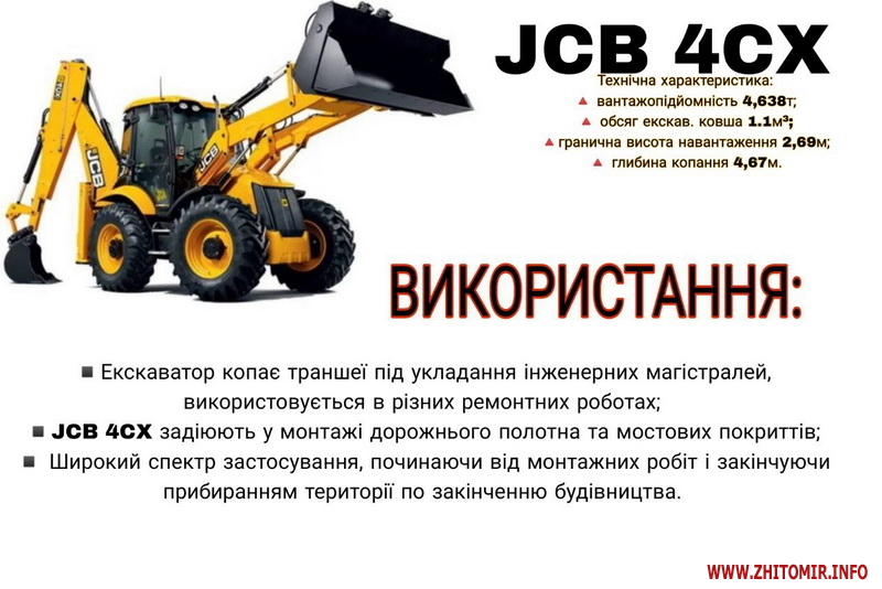 - JCB CX4 (грейдер, навантажувач, екскаватор, гідробур, ковш на 30/60/90);