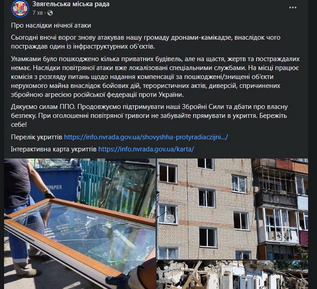 Вночі росія атакувала Звягельську громаду, внаслідок чого постраждав один із інфраструктурних об'єктів, а уламки пошкодили будинки. На місці працює комісія з розгляду питань щодо надання компенсації за пошкоджене та знищене житло.